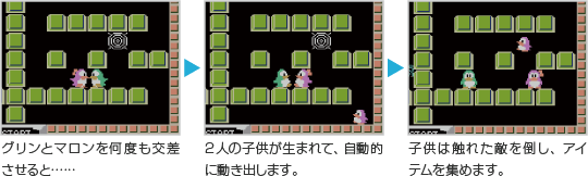 このゲームには、「敵を一定数倒すと出現するアイテム」「特定のブロックを攻撃すると出現するパネル」「2人の子供」など、たくさんの隠し要素があります。隠し要素を見つけると、スコアや残り数がアップするなど、いいことがあります。 ![]() |