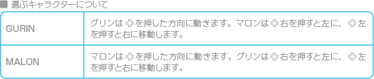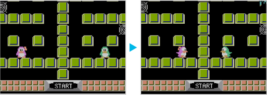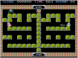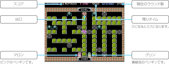 グリンとマロンを動かし、出口に移動させます。2人同時に出口に着くと、ラウンドクリアです。残りタイムに応じた得点を獲得し、次のラウンドに進みます。