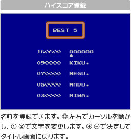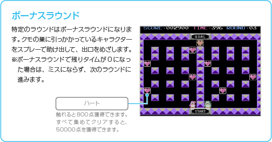 「グリンとマロンのどちらかが、クモやファイアーボールに触れる」「2人ともクモの巣に触れて動けなくなる」「残りタイムが0になる」のいずれかでミスになり、残り数が1減ります。残り数が1のときにミスをすると、ゲームオーバーです。スコアがベスト5に入っている場合はハイスコア登録に進み、入っていない場合はタイトル画面に戻ります。