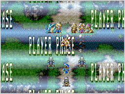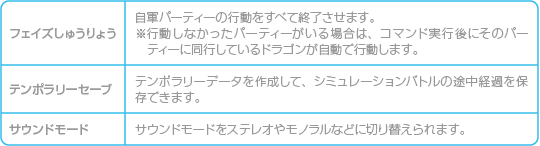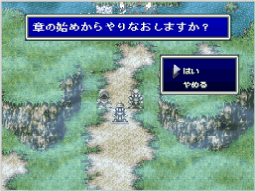 主人公のパーティー全員が「戦闘不能」または「石化」になるとゲームオーバーとなり、シミュレーションバトルを初めからやり直すかどうかの選択肢が表示されます。 「はい」を選ぶと編成画面に進む直前からスタートし、「やめる」を選ぶとタイトルデモに戻ります。 |