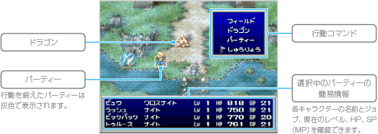 ※パーティーがフィールドコマンドを使った場合は、パーティー全員が経験値をもらえ、ドラゴンが使った場合は、ドラゴンだけでなく同行するパーティー全員も経験値を入手できます。