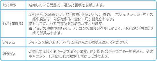 パーティーが戦闘を行う場合は、最初に戦闘コマンドから各パーティーメンバーの行動を選びます。コマンドを選ぶと戦闘が始まり、自軍と敵軍のパーティーがすべて行動すると戦闘終了となります。なお、ドラゴンが戦闘する場合は戦闘コマンドを選べず、自動で戦闘が進みます。 ![]() ![]() |