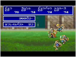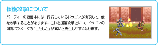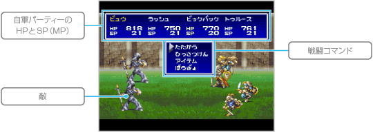 プレイヤーフェイズでパーティーが行動コマンドの「たたかう」を選んだり、エネミーフェイズで敵が戦いを挑んできた場合に戦闘が始まります。なお、ドラゴンが敵に戦いを挑んでも戦闘が始まります。 |