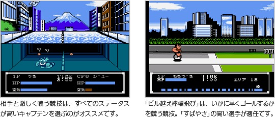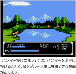 「ハンマー投げゴルフ」や「ビル越え棒幅飛び」のコース、「はちゃめちゃ柔道」で各選手が使える技などは決まっています。なかなか勝てないときは、「れんしゅうモード」で練習し、コースの構造や技の順番を覚えるのがオススメです。 |