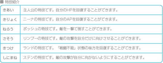 キャラクター固有の特技を使います。特技の種類はキャラクターによってさまざまです。ただし、失敗してしまうこともあるので注意しましょう。 ※バトルコマンドの名称はキャラクターによって異なります。 |