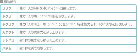 AP(アビリティーポイント)を消費して、魔法や技などの特殊能力を使います。 使いたいものを選びましょう。 |