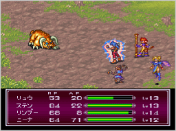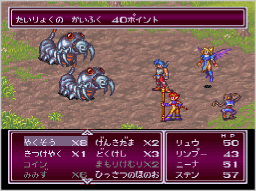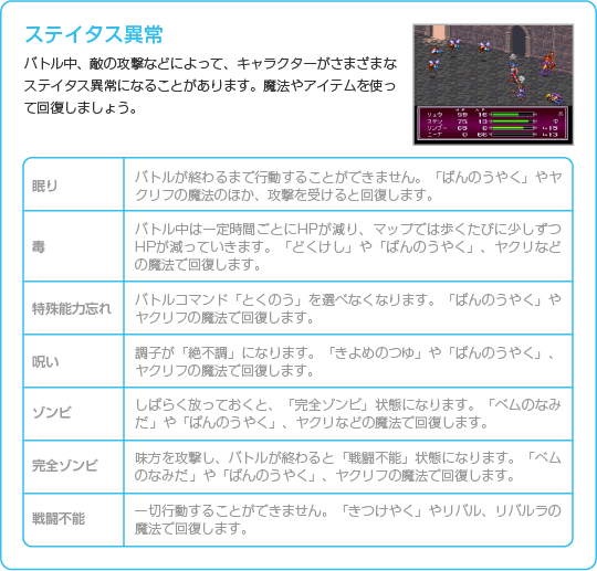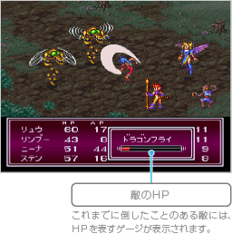 バトルコマンドを選び、パーティーのキャラクターたち1人1人の行動を順番に決めましょう。敵をすべて倒すと勝利となり、お金(ゼニー)とEXP(経験値)が手に入ります。 なお、味方全員のHPが0になってしまうと全滅となり、所持金が半分になった状態で、前回セーブした地点にもどります。 |