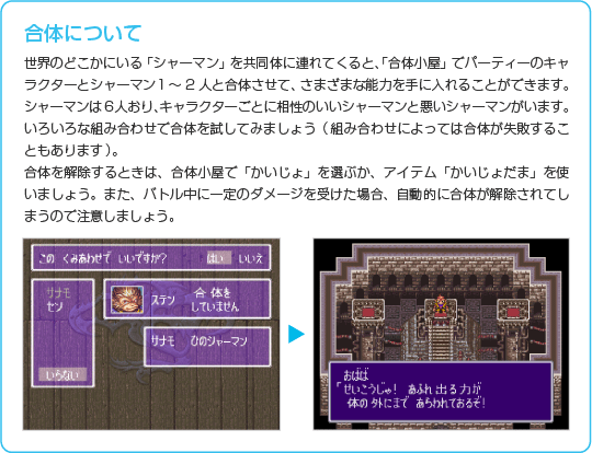 共同体にはさまざまな人々を連れてくることができ、住人が増えると共同体内に武器屋や遊戯場などの施設が増えることがあります(施設の種類は住人の職業によって変わります)。世界各地を回って住人となってくれる人を見つけ出し、自分だけの共同体を作り上げましょう。 ![]() |
