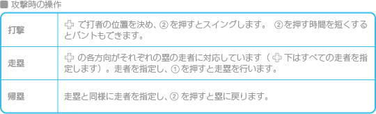 打撃中は打撃操作を行ったり、走塁操作で盗塁やヒットエンドランなどを狙ってみましょう。 球を打ったあとは状況を見て、走塁操作や帰塁操作を行ってください。 |