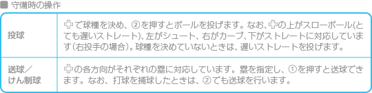 守備側は投球を行うほか、状況に応じて送球操作を行うことができます。 |