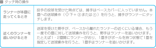 走者にタッチをする必要がある状況では、以下のような操作が行えます。 |