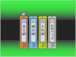 ストーリーモードを選択すると、「東京編」、「横浜編」、「大阪編」といった3つのストーリーと「前回のつづき」が表示されます。初めからプレイする場合は、いずれかのストーリーを選んでください。続きからプレイする場合は、「前回のつづき」を選び、対戦のあとに表示されたパスワードを入力します。 |