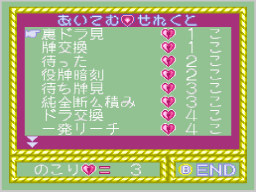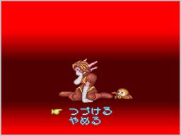 持ち点がマイナスになるか、半荘終了時に相手より持ち点が低いとゲームオーバーになります。ゲームを続ける場合は「つづける」を選び、ゲームを終わる場合は「やめる」を選んでください。「やめる」を選ぶとタイトル画面に戻ります。 |