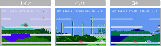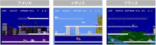 舞台となるステージは6つの国々で、ステージごとに登場するパトカーや背景、ハイウェイのパターンが変わっていきます。がらりと変わる背景を楽しみながら、ゲームを進めていきましょう。 ![]() ![]() |