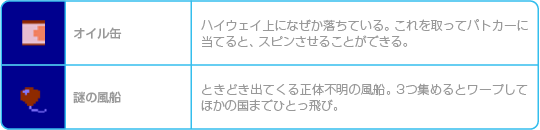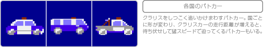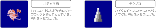 ステージによってパトカーの種類が変わります。また、オジャマ猫とタケノコには、オイル缶が効きません。