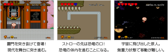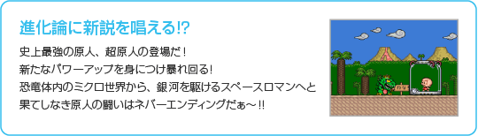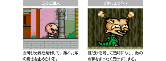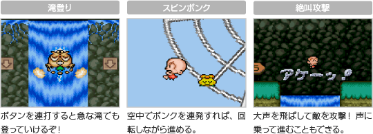 原人は、敵をボンク(頭突き)で攻撃します。また、垂直な壁にしがみついて登る「根性登り」や、木に噛みついて回転する「大車輪」など、野性味あふれるアクションが盛りだくさんです。 ![]() |
