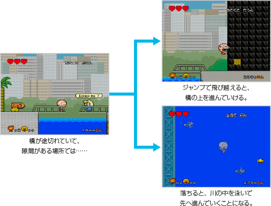 原人は、キャンディーを食べると体の大きさが変わり、肉を食べると姿が変わります。それぞれの状態でのみ使えるアクションがあったり、体の大きさによって通れる場所も変わってくるので、どの姿で進んでいくかが重要です。 ![]() |