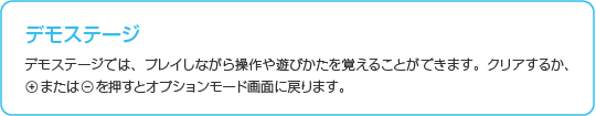 オプションモード画面では、「じゃんぷ」「ぼんく」「xこうげき(特殊攻撃)」のボタンを変更できます。変更したい操作にカーソルを合わせ、使用するボタンを押してください。また、「さうんど」では音声をステレオかモノラルに切り替えることができ、「ためしてみる」を選ぶとデモステージをプレイできます。