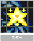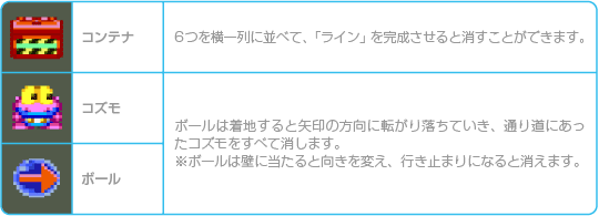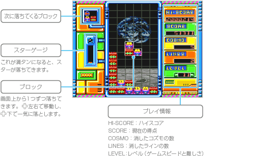 1PモードとVSモードでは、コズモを消すたびにスターゲージが少しずつたまっていき、満タンになると「スター」が落ちてきます。スターは落ちた場所から下の7ライン内にあるコズモをすべて消します。 なお、スターの出現中に ※1Pモードの難易度「EASY」では、ブロックが積み重なってくると1回だけ自動的にスターが出現します。