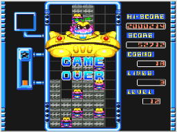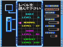 落ちてくるブロックを消し続けてハイスコアをめざす、1人用のモードです。右の画面が表示されたら、 ※レベルが高いほどブロックの落ちるスピードが速くなり、ボールが落ちてくる数が減ります。 |