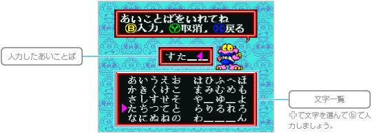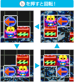 あらかじめブロックが積まれたステージを、限られた手数でクリアすることをめざします。 なお、このモードでは、以前に遊んだときに3〜4文字の「あいことば」を控えていれば、これを入力して続きのステージから遊ぶことができます。モードを選んだあと、「START」でステージ1からゲームを始めるか、「PASSWORD」で「あいことば」を入力するかを選びましょう。 ![]() |