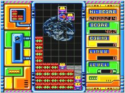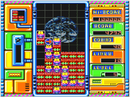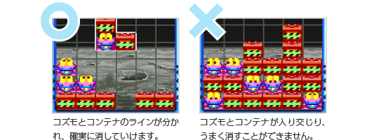 | 左右どちらか一方にコンテナを高く積み上げて、階段状の形を作るテクニックが「階段打ち」。コズモはその上に積んでいき、ボールを最上段から落とせばまとめて消すことができます。また、イザというときには、低い段にコンテナを落とせば、すぐにラインを下げることもできるのです。非常に便利な積みかたなので、ぜひマスターしましょう。 | ![]() |