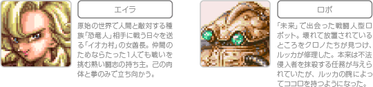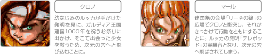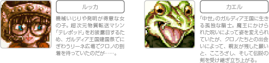 クロノは、5つの時代を行き来するなかで、「マール」「ルッカ」「カエル」「エイラ」「ロボ」の5人の仲間と出会います。 ![]() ![]() ![]() |