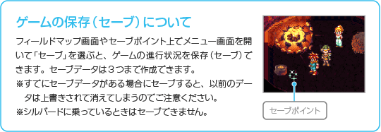 「シルバード」は未来で手に入れることができるタイムマシンで、ゲームを進めると手に入ります。機体に重なって また、冒険が進むと、飛行機に姿が変わり、空を飛べるようになります。降りるときは ![]() |