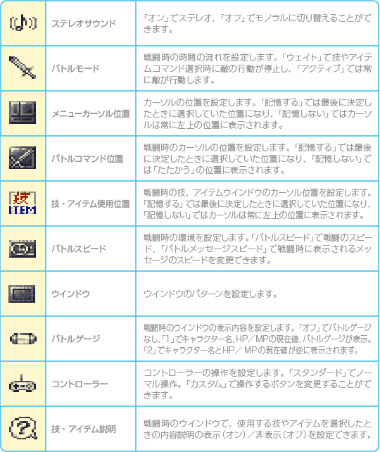 ゲームの進行状況をセーブできます。町やダンジョンでは、セーブポイントの上にいるときのみ選べます。 |