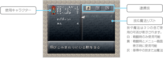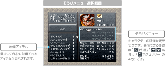 メニュー画面では、コマンドを選んでキャラクターの状態を確認したり、アイテムや魔法を使うことができます。 |