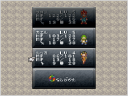 パーティのステータスの確認と、武器や防具の変更ができます。装備の変更は、キャラクターを選んで |
