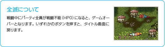 フィールド移動中、特定の場所に立ったり、画面上の敵に接触すると戦闘になります。 |