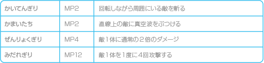 技を使うと、MPを消費することで、キャラクターが得意とする武器を使って攻撃できます。 |