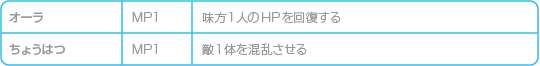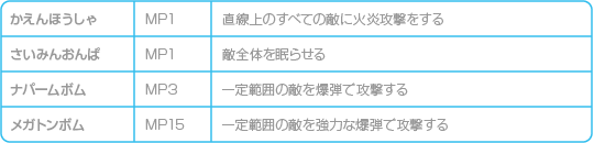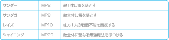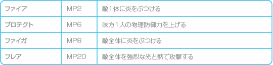 MPを消費することで、魔法を使うことができます。魔法には「天」「火」「水」「冥」の4つの属性があり、それぞれ覚えられるキャラクターが決まっています。また、魔法を覚えられないキャラクターもいます。 |