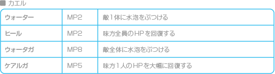 「水」の魔法は、マールとカエルが覚えられますが、内容が異なります。 ![]() ![]() |