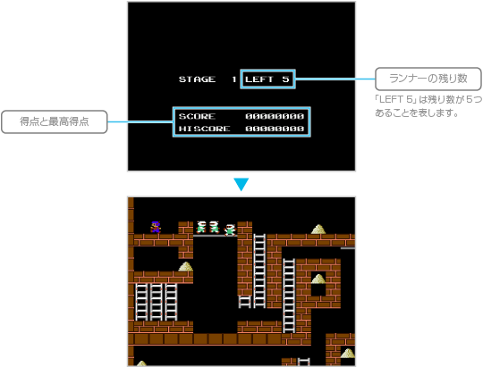 ランナーの残り数(LEFT)や最高得点などが表示されたあとにステージ1が始まります。