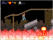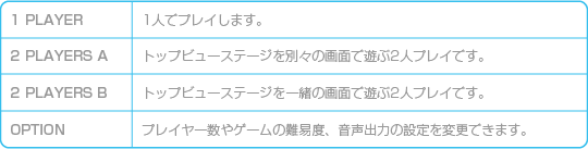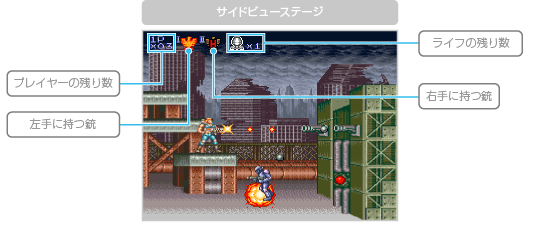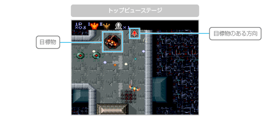 敵を倒しながら進んでいき、各ステージのボス敵を倒すとステージクリアです。 トップビューステージの場合は、ステージ開始時に ※一定量の敵を倒すとプレイヤーの残り数が1つ増えます。 ※アウトになると使っていた武器は通常の状態に戻り、ボム数も1に戻ります。乱れ撃ち中は両方の銃が通常の状態に戻ります。 |