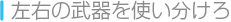 乱れ撃ちを行うと、前後左右のあらゆる方向の敵を攻撃することができますが、アウトになると両方の武器を失ってしまいます。敵が四方に散っているときなど、状況に応じて使うようにし、使用時は敵の攻撃に注意しましょう。 |