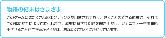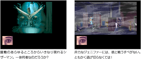ゲームは、ジェニファーが孤児院の先生や友人たちとともに、養女として屋敷を訪れるところから始まります。しかし、やがて友人たちは悲鳴とともに忽然と姿を消してしまいます。一人取り残され、屋敷の中をさまようジェニファー。彼女の行く手には、想像を絶するような恐怖が待っています。 ![]() |