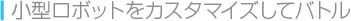 『カスタムロボV2』では、ロボやパーツの組み合わせが重要になります。組み合わせることができる部分は、「ロボ」「ガン」「ボム」「ポッド」「レッグ」の5つ。これらを自由にカスタマイズして、さまざまな戦術を楽しみましょう。 ロボやパーツは、特定のバトルに勝つと手に入れることができます。たくさん集めてカスタマイズの幅を広げてください。 ![]() |