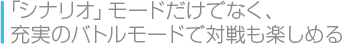 プレイヤーが主人公となって冒険を進める「シナリオ」モードは、「旅立ち編」と「激闘編」の2本立てになっています。「旅立ち編」では物語に沿って冒険やバトルを進めていき、「激闘編」では強力なライバルたちとのバトル大会が繰り広げられます。 また、バトルだけを楽しみたい人向けに、友だちとステージやロボを自由に選んで対戦する「VSバトル」や、2人でタッグを組んで最大4人まで対戦できる「2on2バトル」、相手のロボやパーツなどを選んで対戦の練習をする「フリーバトル」があります。 冒険を進めて手に入れたロボやパーツを使って、カスタムロボの世界を思う存分楽しみましょう。 |