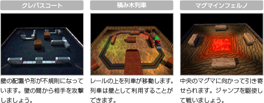 バトルステージとなるホロセウムは、40種類以上登場します。ホロセウムには、さまざまな障害物やギミックが存在し、壁の位置なども違うため、地形に合わせた戦略を練る必要があります。 ![]() |
