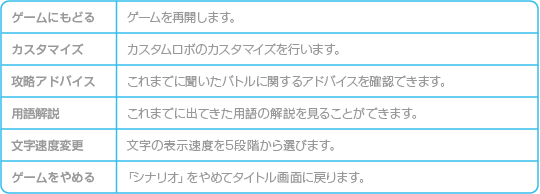 移動中などに なお、「ゲームをやめる」を選んでタイトル画面に戻るとセーブされず、次に遊ぶときは前回セーブしたところから再開するのでご注意ください。 |