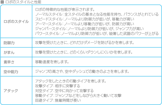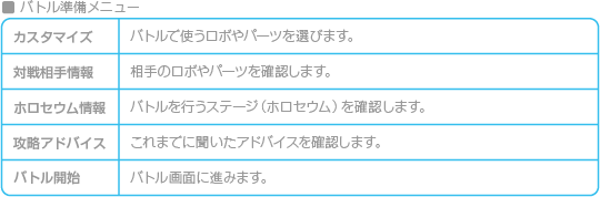 「シナリオ」で物語を進めていくと、バトルが発生します。バトル開始前に対戦相手のロボが表示されるので、確認したら バトル準備メニューでは、以下のメニューが表示されます。ロボのカスタマイズや情報の確認が終わったら、 |