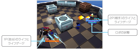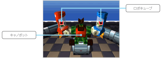 を押すか「バトル開始」を選ぶと、バトルが始まります。画面中央のキャノボットから、ロボがサイコロのようなロボキューブ状態でうち出されるので、方向を