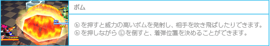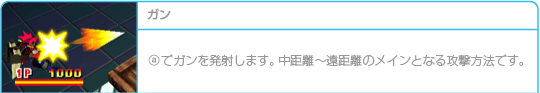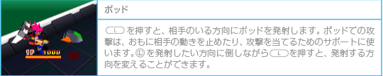 攻撃方法には、「ガン」「ボム」「ポッド」「アタック」があります。 ![]() ![]() ![]() ![]() |