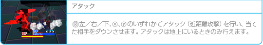 アタックには「攻撃タイプ」「対空タイプ」「移動タイプ」「回避タイプ」があり、ロボによってアタックのタイプが決まっています。使用するロボのアタックタイプは、カスタマイズ画面で確認しておきましょう。 なお、アタック中に赤く光っているときは無敵になりますが、アタックを行う前と行ったあとのスキは大きいので注意しましょう。 |