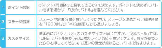 「ポイント選択」→「ステージ選択」→「カスタマイズ」の順に設定をしてバトルを始めましょう。