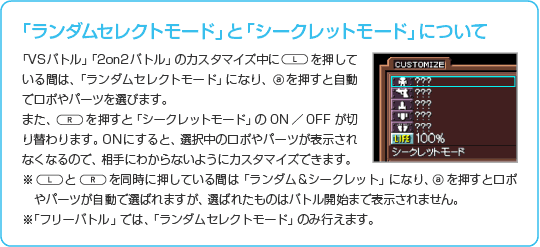 タイトル画面で「VSバトル」を選ぶと、「シナリオ」で手に入れたロボやパーツを使って友だちとバトルできます。