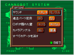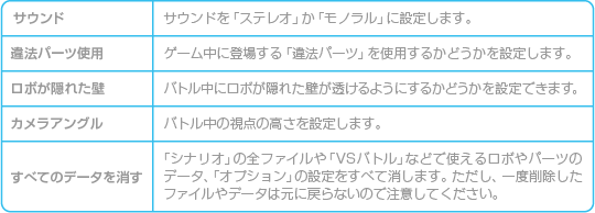 ゲームの各種設定を行ったり、データの削除ができます。なお、「違法パーツ使用」「ロボが隠れた壁」「カメラアングル」の設定は、「VSバトル」「2on2バトル」「フリーバトル」でのバトルに反映されます。